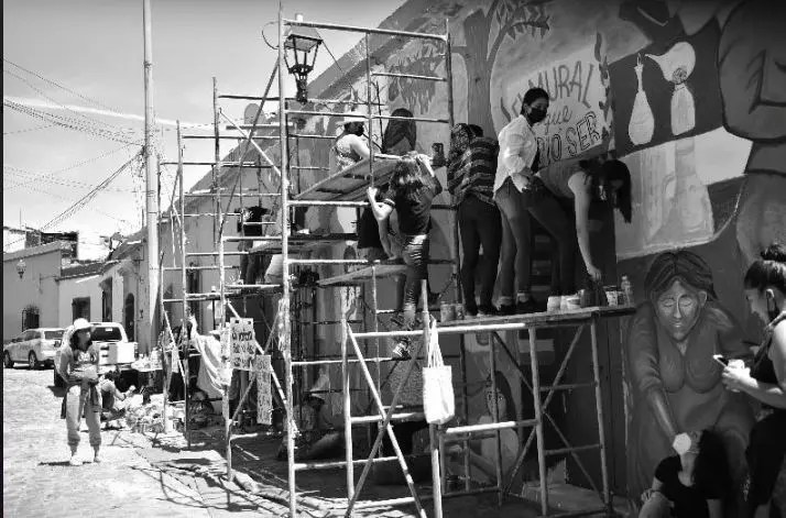 Las gestoras refieren que durante el proceso de ejecución del mural se compartieron saberes y se colaboró de forma horizontal. Esto contribuyó a resolver los retos que se presentaron a nivel plástico y logístico como el armado de andamios.