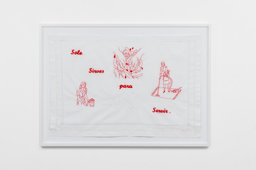 Los bordados son hechos con hilo rojo, color que la artista vincula con la sangre, la muerte, la violencia, y, simultáneamente, al amor complejo y profundo. Además, elige materiales como servilletas de segunda mano que fueron hechas por mujeres, frecuentemente considerada como una labor irrelevante. Los materiales textiles que utiliza no son arbitrarios.